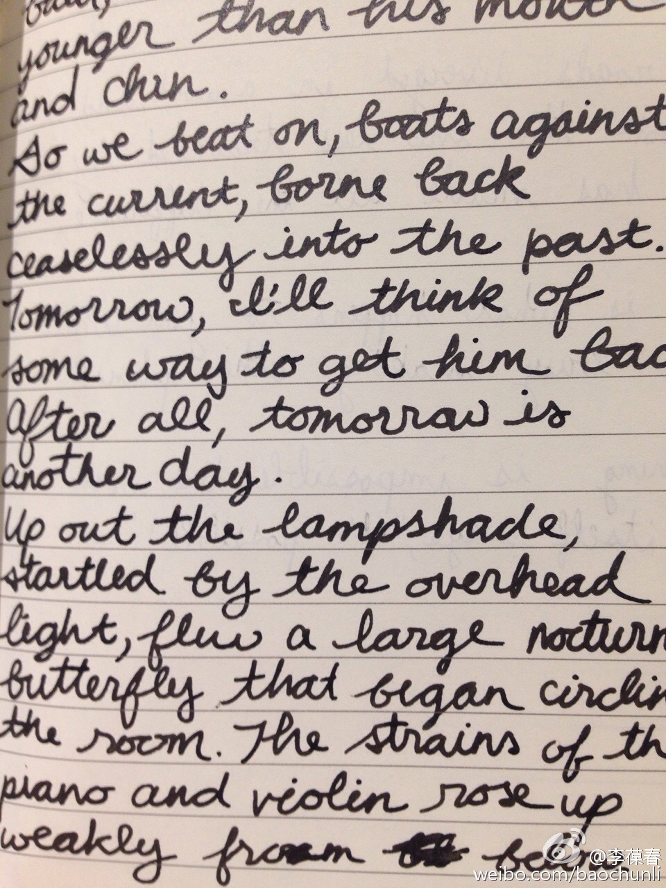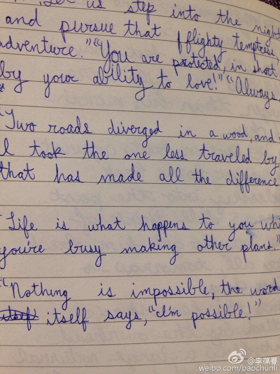 姐姐抽空试了试我的Pilot Vanishing Point,极黑墨水,英文龙飞凤舞,浑圆中略带粗旷,又不失端庄之美。妹妹则选中了一支最便宜的圆珠笔,骨感十足,笔风细腻而内敛,姐妹俩各擅胜场。看了一小会儿,我甚至没注意写了些什么:「Life is what happens to you while you are busy making other plans.」