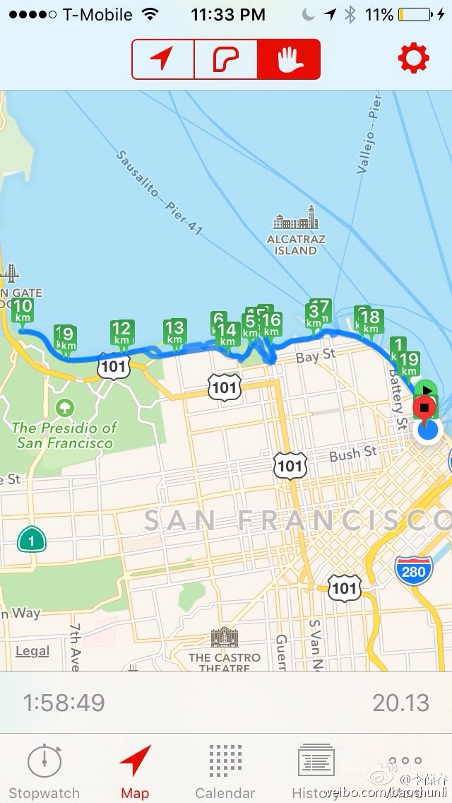 再次来到旧金山,很想再近距离瞧一眼金门大桥。于是下午从酒店出发沿着海边跑,到金门大桥折返,全程20公里,5分49秒的平均配速,创个人最好成绩。海风很大,温度适宜,太阳晒得很舒服。海边跑步骑车的人很多,大多数跑得比我快。
