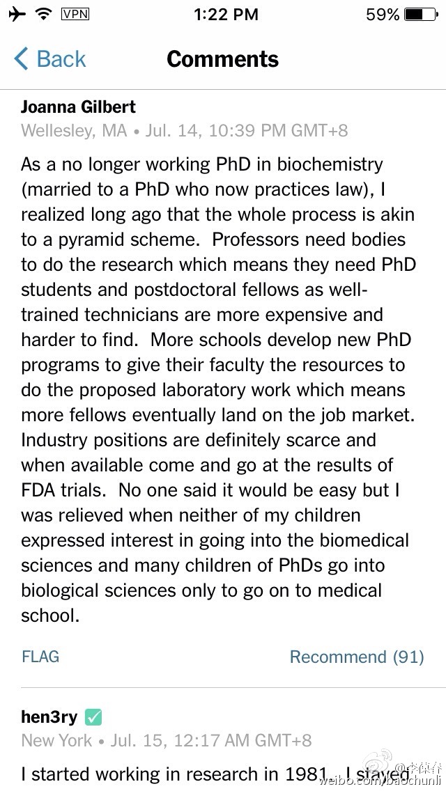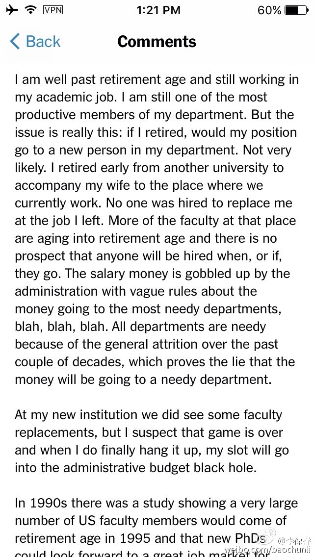 纽约时报The Upshot发表长文,分析了美国大学里教授职位越来越少而授予的博士学位越来越多的现象,博士毕业很难申请到教职。最爱看那几百条的评论,从博士生到老教授,各抒己见,精彩纷呈。如果国内大学待遇真能稳步提高到美国的水平,美国学术人才大规模流入中国,大概只是自然地遵循了市场规律而已。