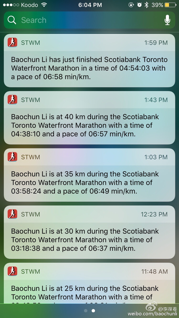 今天小雨,最终以4:54:03第二次完成多伦多马拉松,均速6:58/km。前半程正常发挥,可惜30公里以后实在没力气了,但总算还是坚持跑完,跑完已经走不动路了。苹果手表续航很不错,跑完还有40%的电量,我用来随时监控心率,太快就坚决减速。一路上见到最好玩的标语是:「If Trump can run, you can too. 」