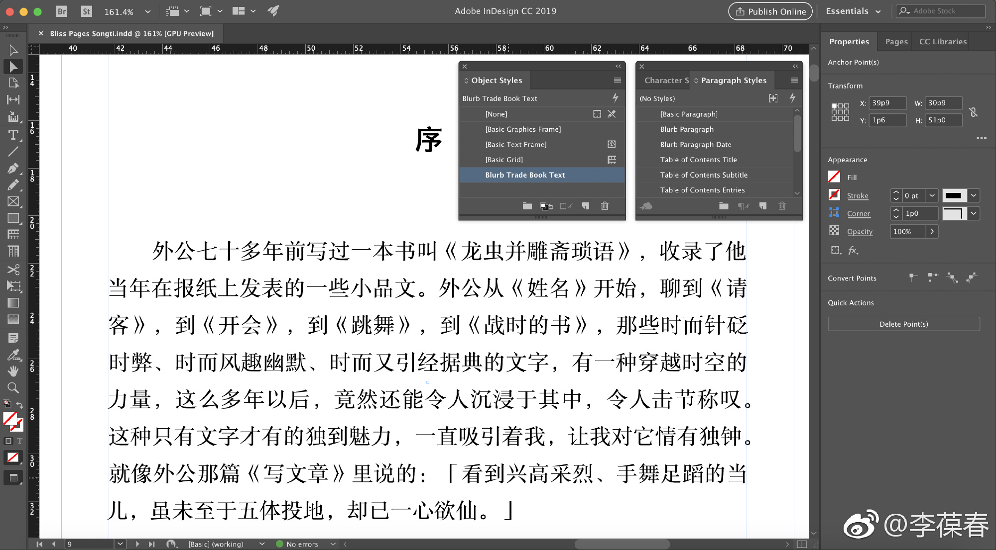 原先使用的排版系统过于简单,无法自动支持中文排版所需要的段落首行缩进两格和标点悬挂,中英文混排时也无法单独选择英文字体。改用Adobe InDesign重新排版以后,发现专业的系统就是不同,不但排版效果非常出色,而且由于使用了各种字符、段落、版面样式,全书整齐划一,还节省了不少时间。