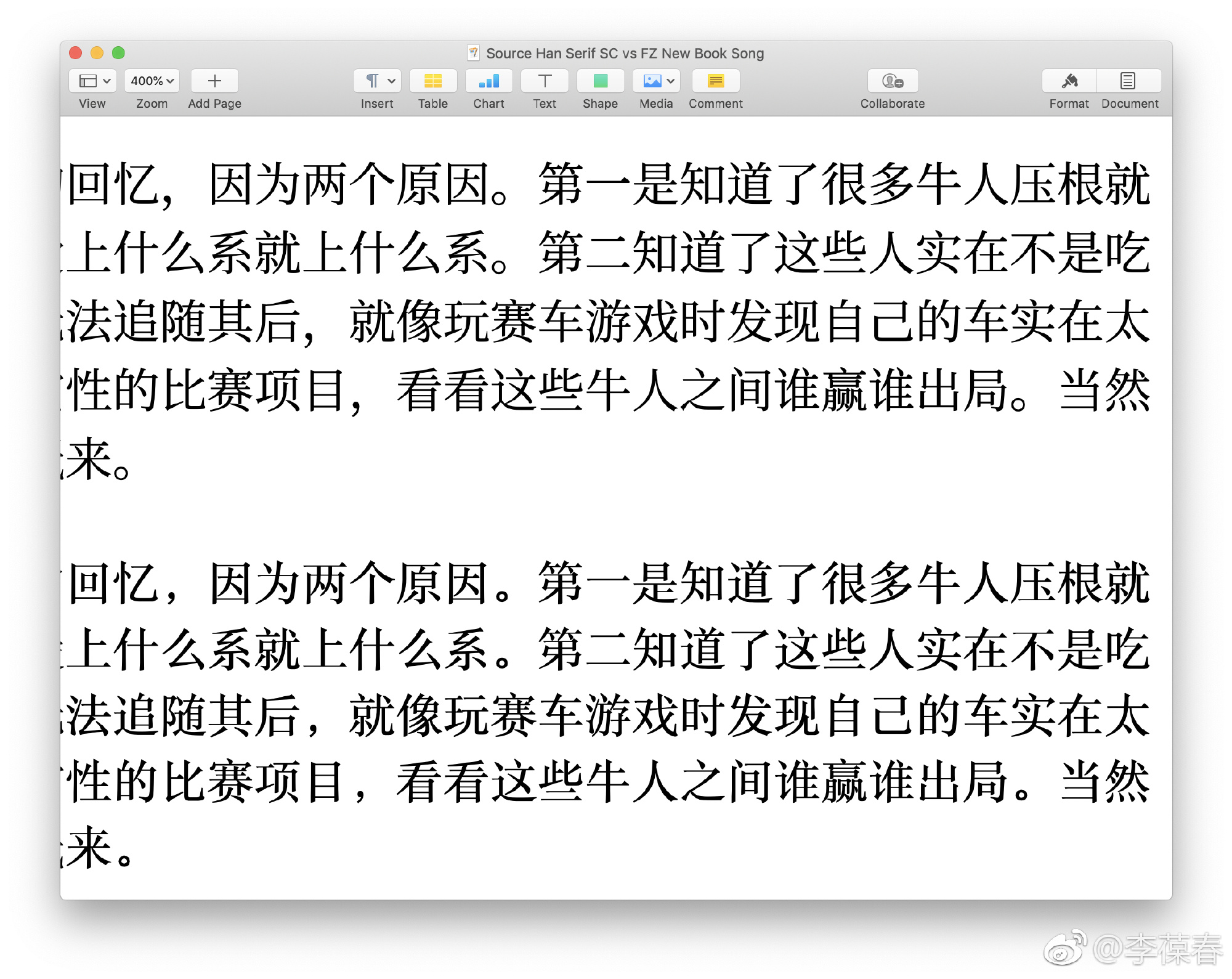 字体的选择也是一个问题。用作标题的黑体自然采用冬青黑体和SF Pro Display混搭,这是苹果中文官网的标配,也是我的最爱。而正文的宋体选择则颇费了一些周折。本来打算用两年前Adobe开源的思源宋体,但是和方正新书宋体比较,思源宋体明显处于下风:标点符号和前面的字间隔太近,「些」字的两横像小学生写的,「是」字的间架结构也不够完美。
