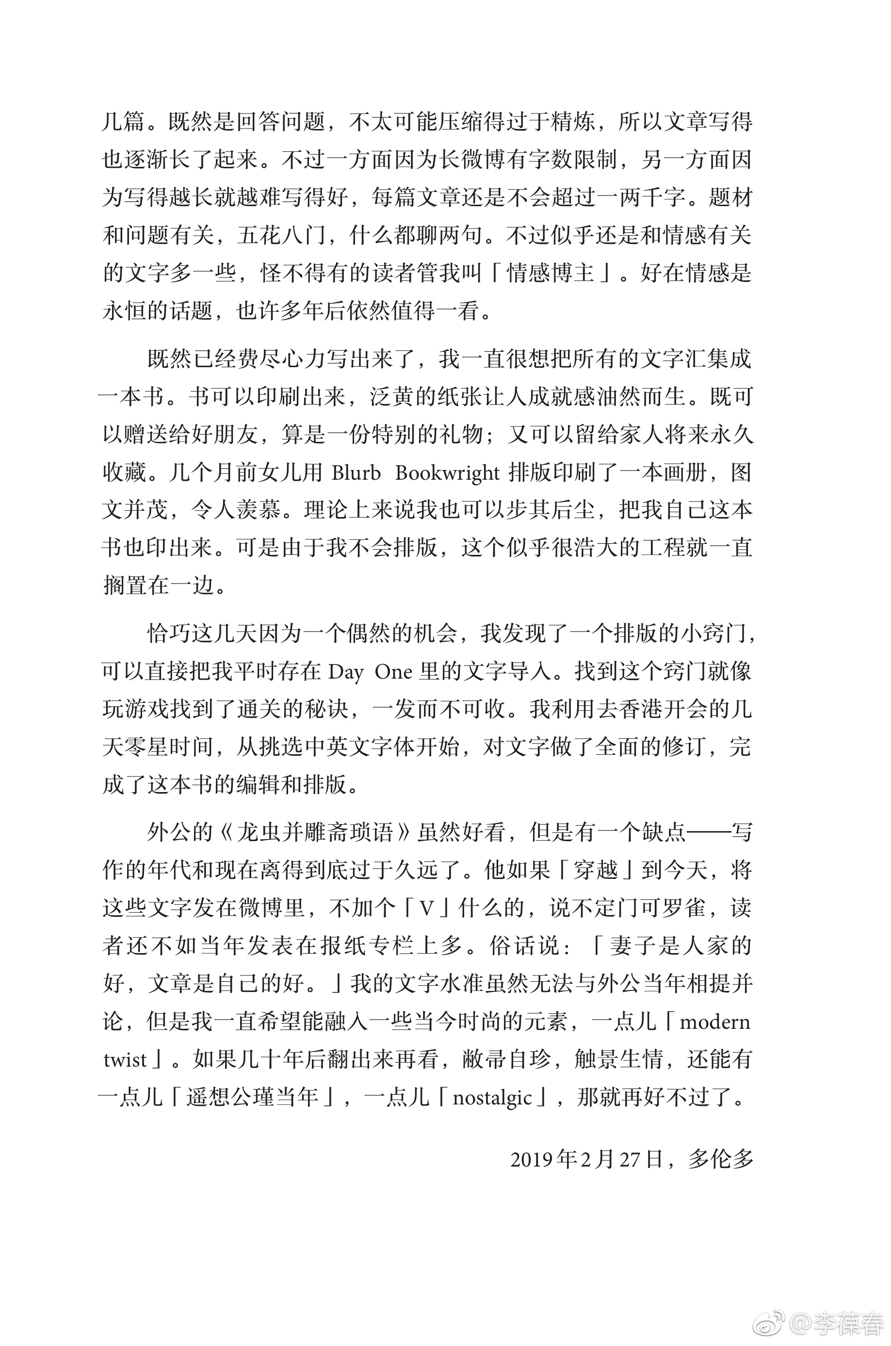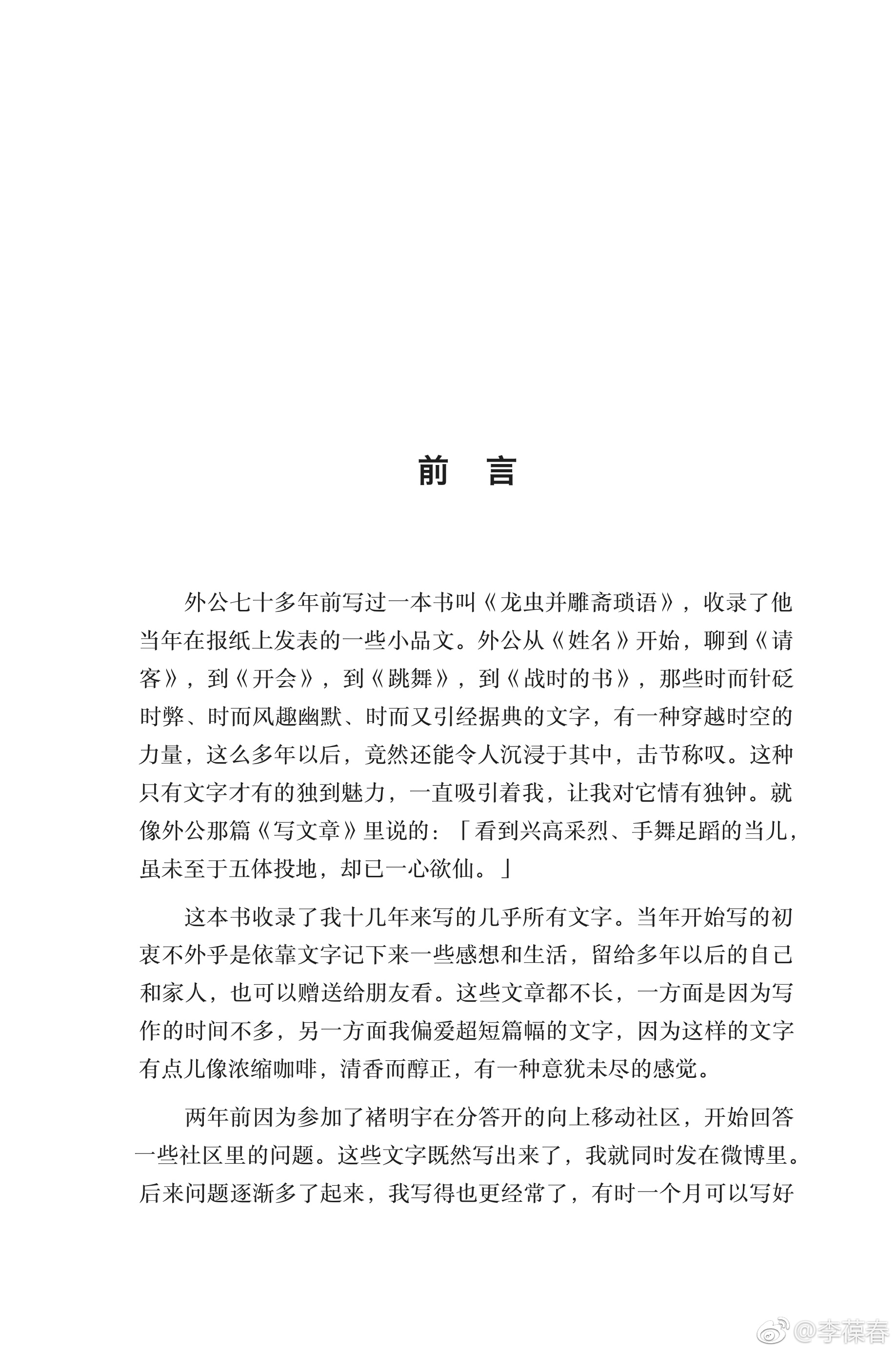 这本书收录了我十几年来在微博等社交媒体上发表过的几乎所有文字,包括近两年来的问答。全书大约十二万字,每一句话都仔细做了校对和修订。在排版过程中,对中英文混排做了大量细致的工作,目的是保证书的每一页都美观、易读。