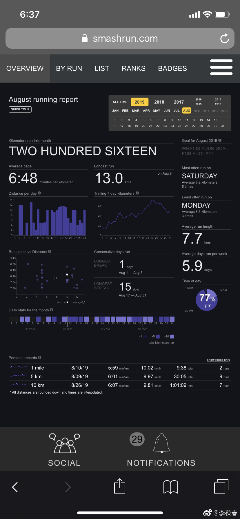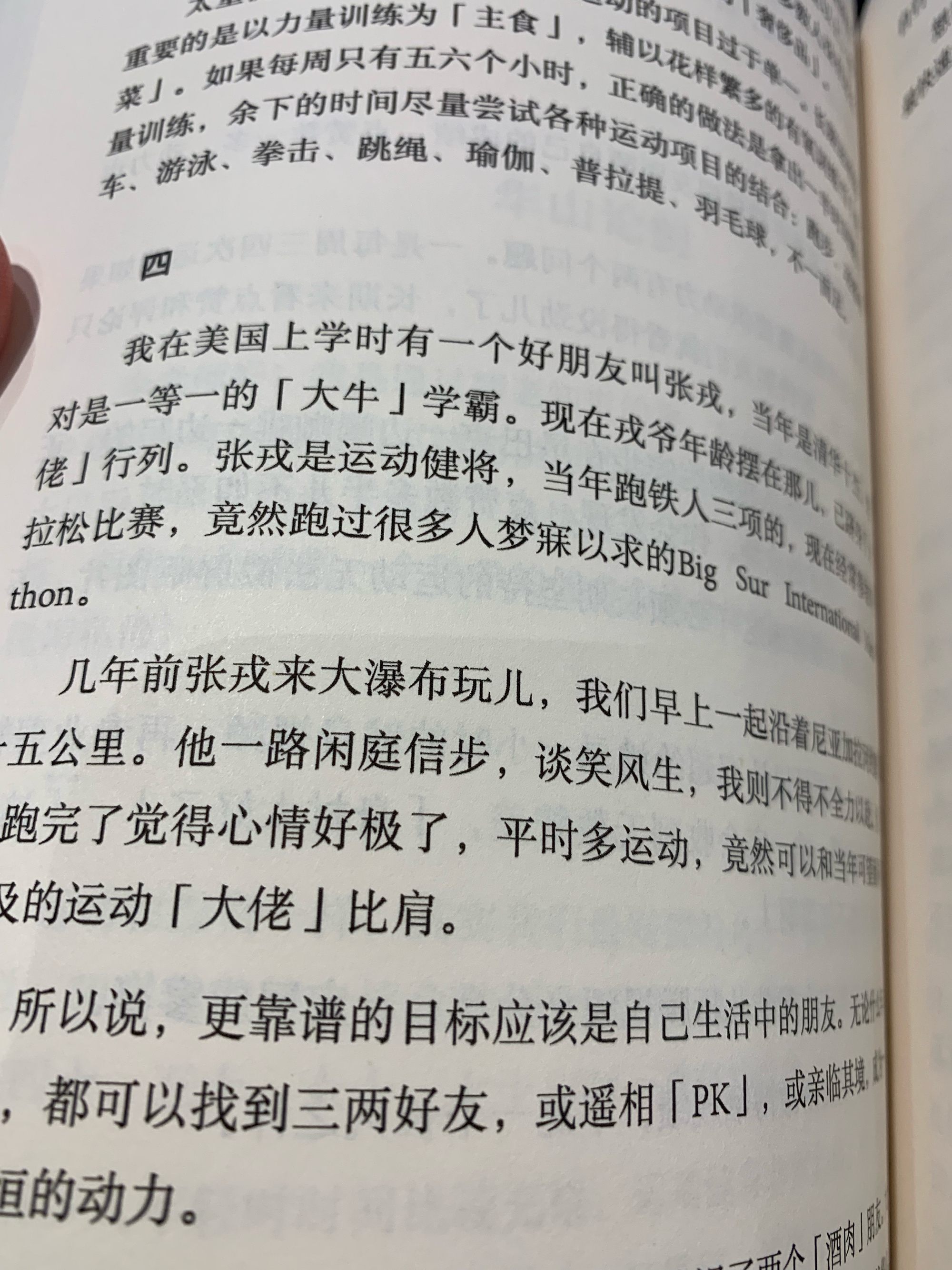 一是长跑训练时提高跑量,做到了多年来一直没有做到的连续十五天不间断。十五天一共跑了130公里,八月份一共跑了216公里,打破了四年前的单月跑量个人最好成绩。九月计划进一步提高重量训练的强度,提高一天的跑量,不计速度只计距离,从现在的十公里左右提高到二十公里以上。
