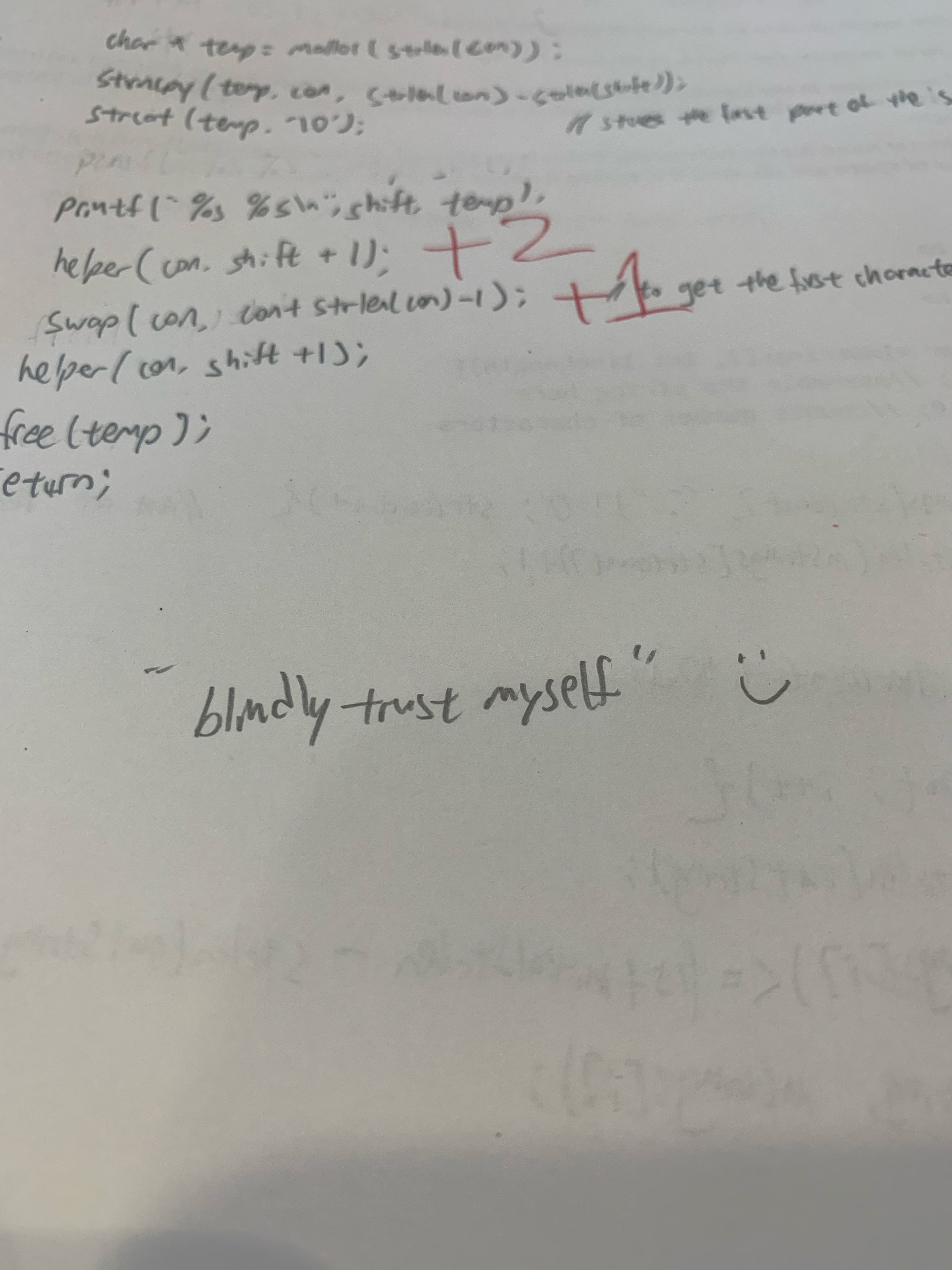 我在课堂上讲递归方法时,一直强调递归调用的根本是「call myself with a smaller problem」(调用自己去解决一个小一点儿的问题)。只要有正确的「base cases」停止递归,就永远可以「blindly trust myself that the smaller problem can be solved」——盲目地相信自己,这个小一点儿的问题早晚可以解决。