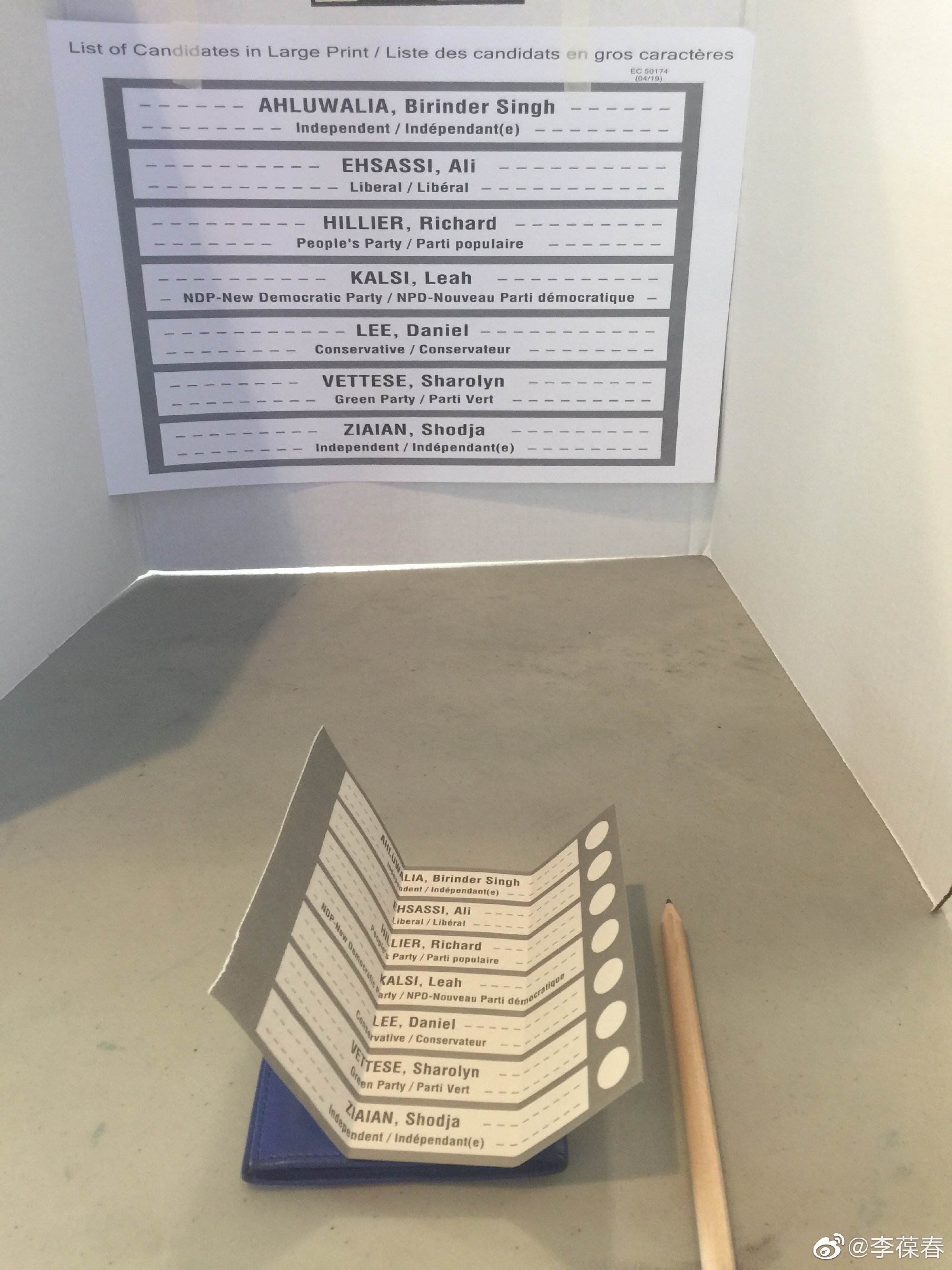 四年前因为出差没能赶上加拿大的选举。今年我怕刚跑完马拉松走不动路,赶早不赶晚,提前一个多星期就早早去投票了。投票站离家走路只有几分钟,没什么人。一位老太太慢悠悠地翻着一个大本子,终于找到我的名字,在上面郑重地画了一个对勾。旁边一位男士给了我一张选票,示意我去他身后很远的一个硬纸板做的屏风后面填写。硬纸板后面只有一支铅笔,让人不禁担心选票会不会被涂改。