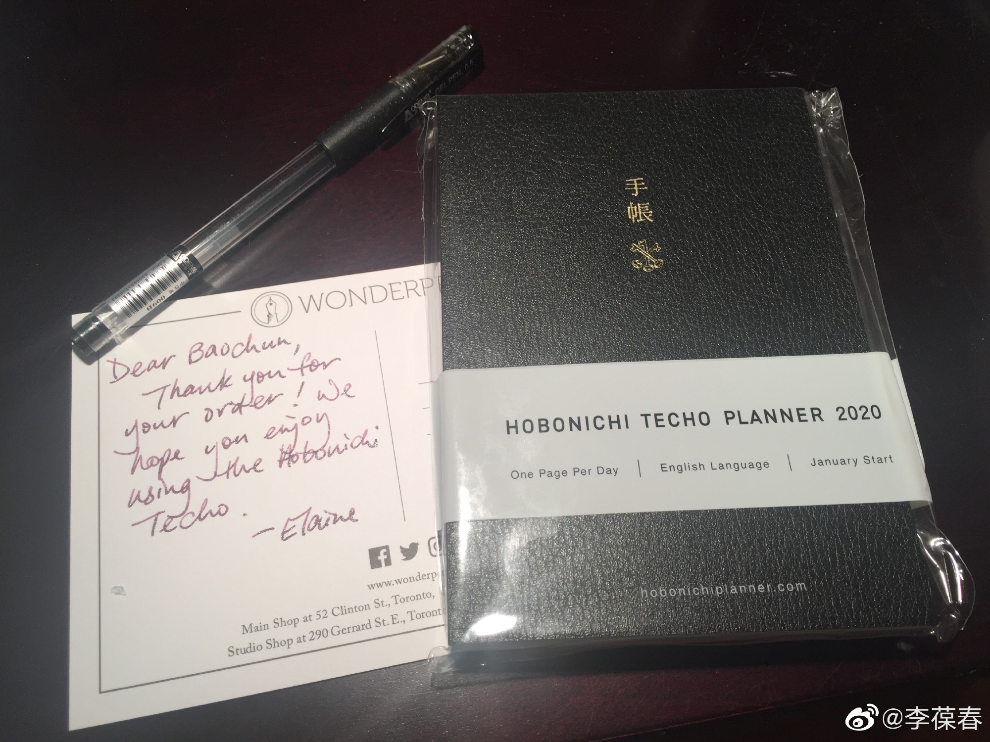 明年的 Hobonichi 日记本早已开始发售。本来可以从日本直接邮购,为了多多支持多伦多本地的小文具店,我还是决定多花点儿钱从一个本地的小店网购。没想到,日记本寄到时,店主还随信给我寄了一张钢笔手写的明信片,对我表示感谢。淡紫色的墨水非同寻常,字也写得很漂亮。按现代的语言来说,我立马就被「圈粉」了——就像我热爱的电影「Jerry Maguire」里说的:You had me at hello.